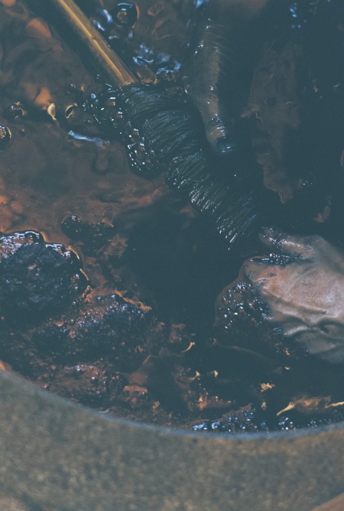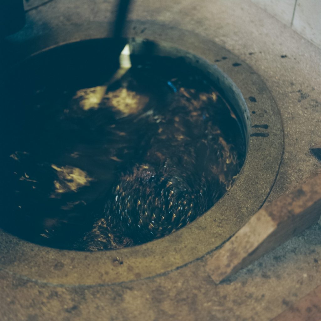 It’s important to give indigo a good environment. After dyeing, the indigo flowers bloom again when stirred.Indigo requires human hands to keep a good balance inside the pot.