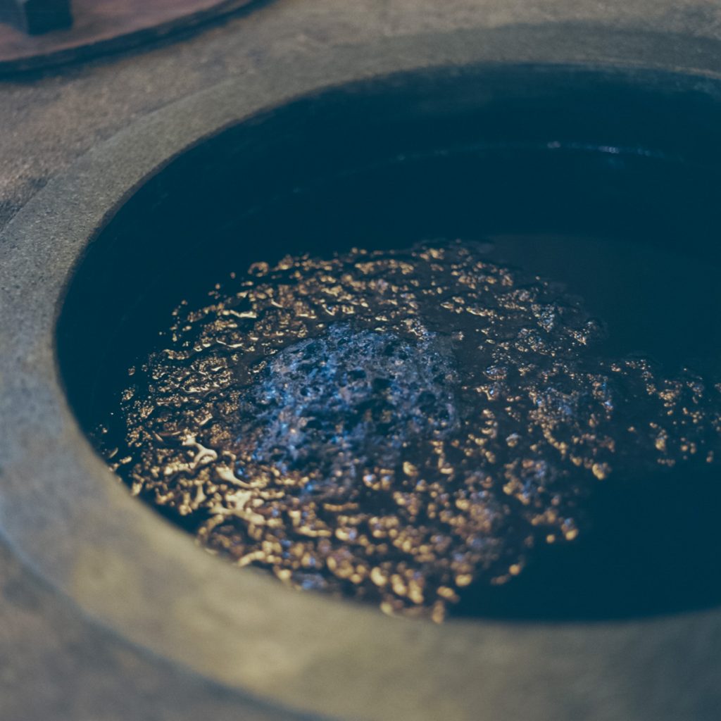 最初は甕の6分目くらいまで原料を仕込み、一日に2回ずつ、この液体を攪拌する。3日ほど経